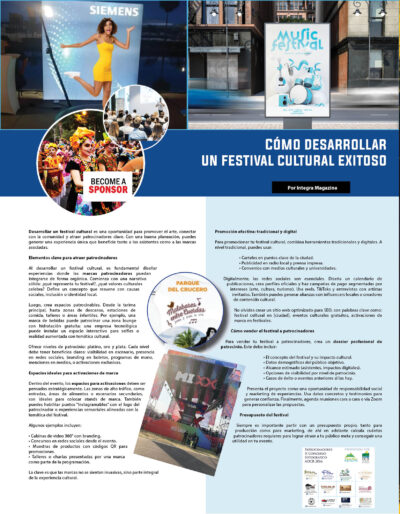Al desarrollar un festival cultural, es fundamental diseñar experiencias donde las marcas patrocinadoras puedan integrarse de forma orgánica. Comienza con una narrativa sólida: ¿qué representa tu festival?, ¿qué valores culturales celebra? Define un concepto que resuene con causas sociales, inclusión o identidad local.